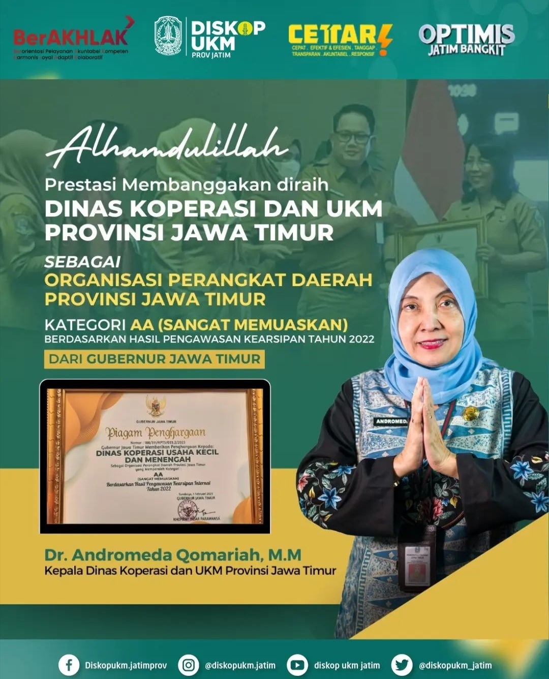 “Alhamdulillah prestasi di awal tahun ini bagi kami semoga menjadi trigger atas prestasi-prestasi lainnya,” ujar Kepala Diskop-UKM Jatim, Andromeda Qomariah seperti dipublikasikan di akun instagram resmi @diskopukm.jatim, Rabu (1/3/2023).
