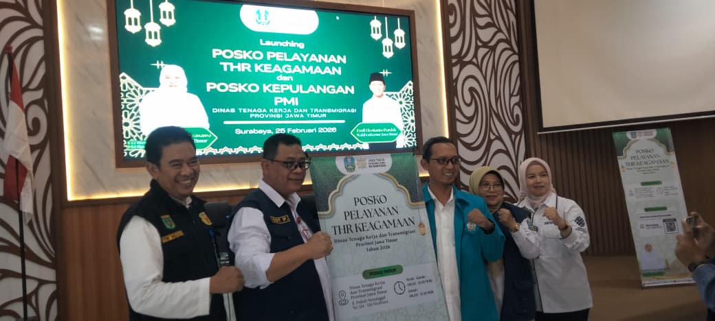 Surabaya, Nusantaradigital.online – Pemerintah Provinsi Jawa Timur melalui UPT Pelayanan dan Perlindungan Tenaga Kerja membuka Posko Layanan Kepulangan Pekerja Migran Indonesia (PMI) di counter helpdesk Terminal 2 Bandara Internasional Juanda. Pembukaan posko ini dilakukan bersamaan dengan peluncuran Posko Pelayanan Tunjangan Hari Raya (THR) Keagamaan 2026, Rabu (25/2).